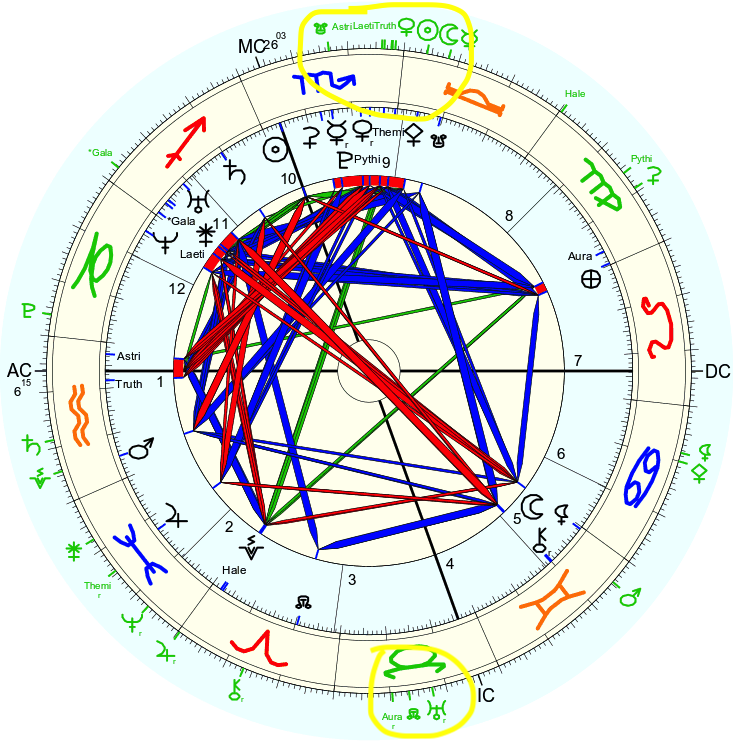 Upper Circle: Astrid, Laetitia, Truth, and Venus conjunct the sun and moon.