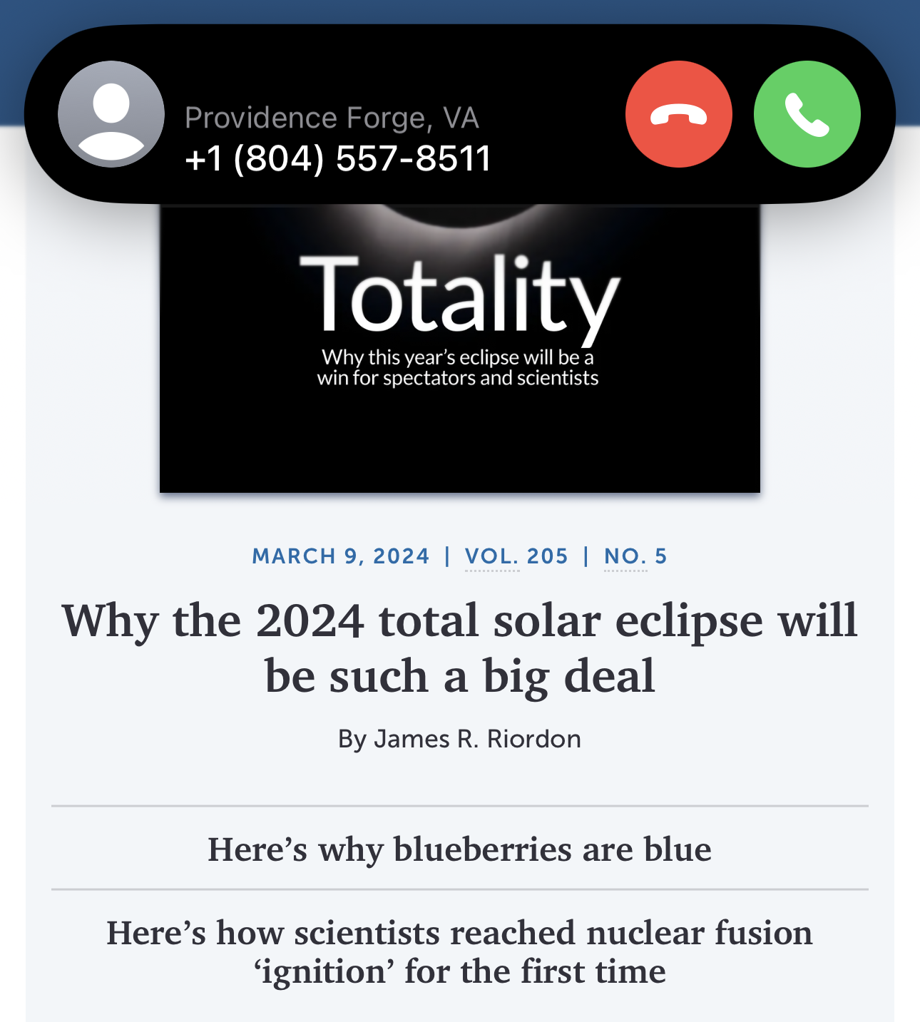 Moments after reading this theory, I pulled out my phone and refreshed ScienceNews.org. I was scrolling past a story about the total solar eclipse, and just as the word “Totality” rose on my screen, an incoming call appeared from someplace called Providence Forge, Virginia.